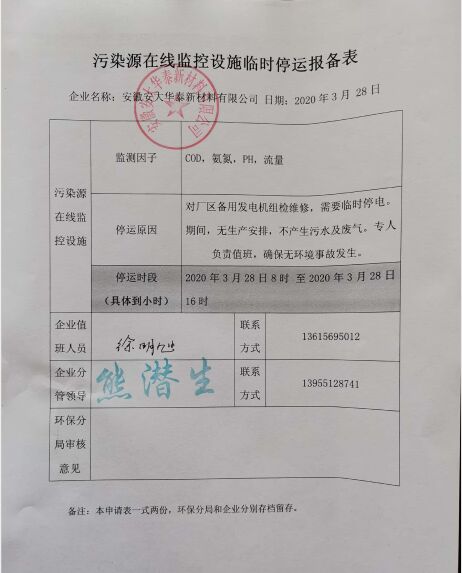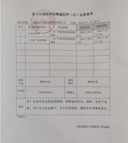2020年3月28日,我公司對廠區(qū)備用發(fā)電機(jī)組進(jìn)行檢維修,于8時(shí)至16時(shí)對全廠進(jìn)行停電,并事先將停電情況及污水在線設(shè)備停運(yùn)報(bào)備給屬地生態(tài)環(huán)境部門。停電期間無污水排放,并安排專人值班,確保環(huán)境安全。