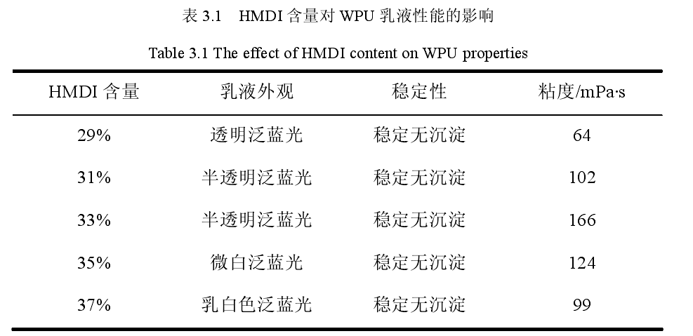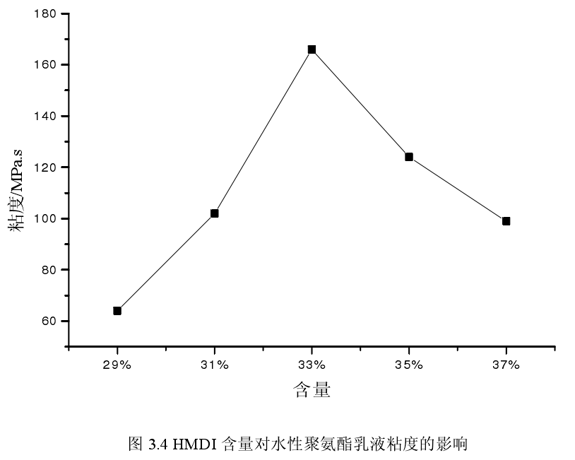 我們可以從表3.1看出,硬段含量隨著HMDI含量的增加而增大,WPU乳液的顏色外觀從透明泛藍(lán)光逐漸變?yōu)槿榘咨核{(lán)光。當(dāng)HMDI含量從29%增大到37%時,硬段含量也隨著逐漸增加,WPU的粘度變化趨勢為先增加,而后下降,出現(xiàn)了一個峰值。換句話說,HMDI占水性聚氨酯總質(zhì)量的33%,水性聚氨酯乳液粘度的峰值是166mPa.s上述現(xiàn)象可以解釋為,在HMDI含量低的時候,硬鏈段含量較小,水性聚氨酯體系中極性基團(tuán)不太多,分子之間地作用力相對較弱,高聚物很容易乳化,得到乳液粒徑小,透明的乳液。HMDI含量逐漸增大,WPU分子鏈中硬鏈段含量也隨著增加,此時,體系中含有較多的極性基團(tuán),如脈鍵,氨酯鍵等,分子之間地相互作用增強(qiáng),使得乳膠粒間相互粘連,不是很容易乳化分散,得到乳液粒徑較大的外乳白色液體。與此同時,因為體系中極性基團(tuán)增多,相互之間作用力很強(qiáng),乳膠粒子的運(yùn)動阻力增強(qiáng),導(dǎo)致水性聚氨酯乳液的粘度增大。當(dāng)硬段含量繼續(xù)增大時,分子鏈間的相互作用力更強(qiáng),體系中形成粒徑較大的乳膠粒,在水中的不容易分散性,與水的均一穩(wěn)定性降低,導(dǎo)致乳液粘度下降。上述結(jié)論也可從圖3.4中非常明顯的看出。從表3.1我們還可以看出,WPU溶液都能夠穩(wěn)定存在,這是因為在上述水性聚氨酯乳液中,設(shè)定DMPA含量是5%。從而在體系中親水基團(tuán)很多,能滿足膠粒穩(wěn)定地在水中分散,能長久穩(wěn)定的存在而不發(fā)生沉聚。
