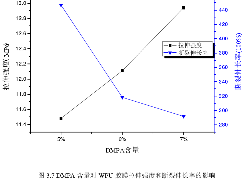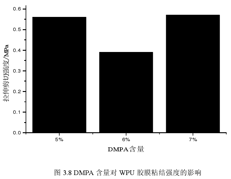 見圖3.7,還可以很明顯的看出,DMPA含量的變大,增大了樣品的拉伸強(qiáng)度,降低了斷裂伸長率。拉伸強(qiáng)度數(shù)值從11.48到12. 94,變化幅度較小,見表3.4。在圖3.8中,可以明顯的看出,當(dāng)DMPA含量為7%時,其拉伸剪切強(qiáng)度達(dá)到最大值,為0.57MPa 。而含量為5%}, 6%時,粘結(jié)強(qiáng)度,相對較小。這是因?yàn)?,離子基團(tuán)含量的增加,除了現(xiàn)有的相互作用力,比如WPU范德華力和氫鍵力,離子之間的靜電作用力也越來越強(qiáng)烈,使得相分離程度提高,且硬段微區(qū)的凝聚力也得以增強(qiáng),總而言之,拉伸強(qiáng)度和粘結(jié)強(qiáng)度都會增大。DMPA含量增加,軟段含量減少,柔韌性降低,且硬段中含有更多量的氫鍵、庫侖力作用,使得膠膜更脆,斷裂伸長率降低。