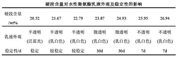 一、硬段含量對水性聚氨酯乳液外觀及穩(wěn)定性的影響