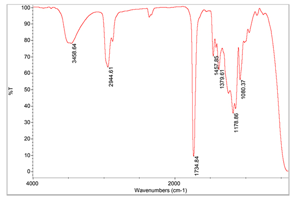 圖2-1為雙組分聚氨酯膠粘劑中A組分的紅外光譜圖。3458.6cm-1為羥基的特征吸收峰。所以這種情況分成多元醇結(jié)構(gòu)。1734.8cm-1為酯基的特征吸收峰,2944.6cm-1,1457.8cm-1,1379.6cm-1分別是甲基和亞甲基的伸縮振動峰,這表明羥基組分是聚酯型多元醇。