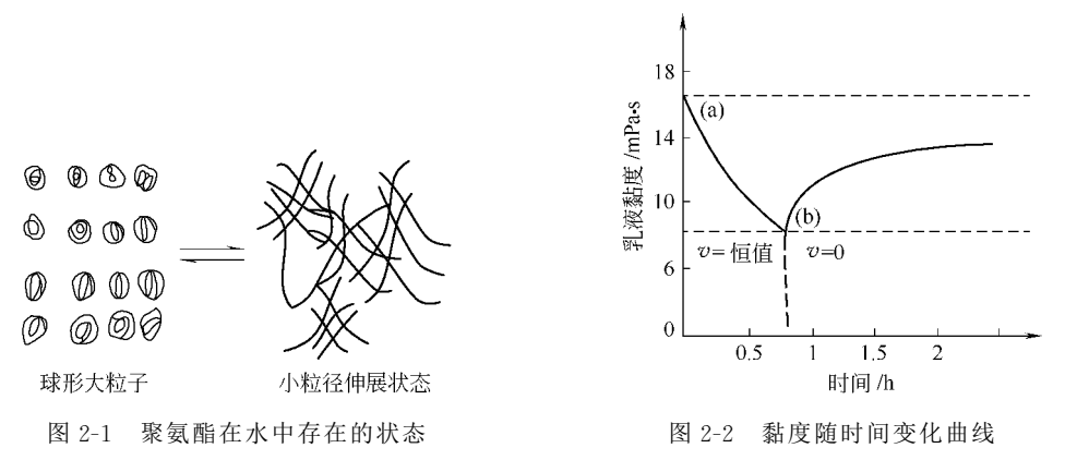 一個(gè)穩(wěn)定的乳液,在長(zhǎng)期重力作用下,不會(huì)產(chǎn)生大量的沉淀物,乳液在放置過程中黏度也應(yīng)沒有較大的變化。將同一聚氨酯溶液分為兩部分,分別進(jìn)行中和,乳化出不同細(xì)度的兩種乳液進(jìn)行比較,發(fā)現(xiàn)粒徑越大,乳液的黏度越低,粒徑越小,黏度越高。從乳液分散狀態(tài)上看,在保證貯存穩(wěn)定的前提下,乳液粒徑越大,彼之間還是相對(duì)有序地排列分散在水中,水溶性大分子以“球形”的卷曲狀態(tài)存在(如圖2-1),在受外力剪切作用時(shí),阻力較少,黏度值較低。當(dāng)乳液顆粒很小時(shí),水溶性大分子不是以“球形”的卷曲狀態(tài)存在,而是以自由伸長(zhǎng)的低能態(tài)出現(xiàn),這種自由狀態(tài)在大分子之間互相纏繞、盤旋、締合、成鍵,造成了分子間、粒子之間的緊密相連,從而導(dǎo)致乳液的黏度明顯升高,有時(shí)甚至在貯存中產(chǎn)生凝解。對(duì)于高固含量的乳液,由于樹脂含量高,顆粒間緊密堆積,接觸面積增大,很容易產(chǎn)生“膠解”現(xiàn)象,最終失去流動(dòng)性。因此,高固含量乳液的合成中,控制適中的乳液顆粒,是乳液穩(wěn)定的一個(gè)前提條件。