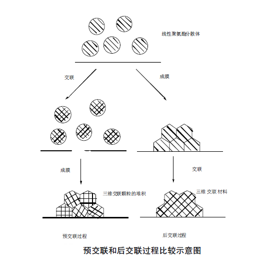 水性聚氨酯分散體交聯(lián)的特殊性主要是交聯(lián)過程和成膜過程的相互影響。交聯(lián)反應(yīng)發(fā)生在成膜之前稱為預(yù)交聯(lián),交聯(lián)反應(yīng)發(fā)生在成膜之后稱為后交聯(lián)。預(yù)交聯(lián)和后交聯(lián)都可以提高水性聚氨酯分散體膜材料的性能,但后交聯(lián)更為有效。下圖為預(yù)交聯(lián)和后交聯(lián)形成的材料結(jié)構(gòu)示意圖。